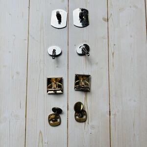 The product is a set of 4 pairs of vintage cufflinks, each featuring a retro theme. These cufflinks are perfect for men looking to add a touch of nostalgia to their outfit. The sets are in nice condition and offer a great value, with a variety of designs to choose from. Perfect for adding a classic touch to any formal or semi-formal ensemble, these cufflinks are a stylish and timeless accessory that will elevate any look.