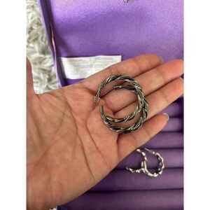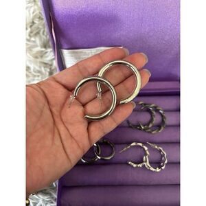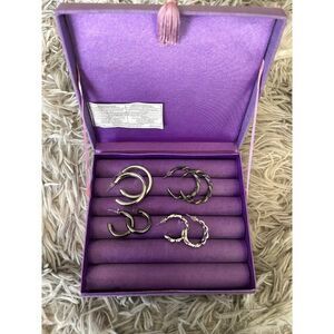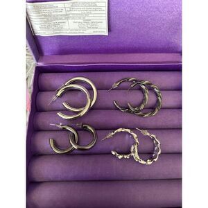 4 pairs of hoops earrings 2 pairs are gunmetal color Other 2 are silver colored Sold as is Purple display box is not included