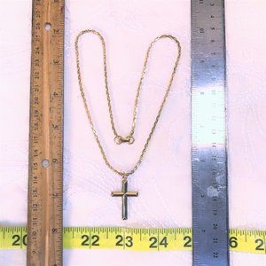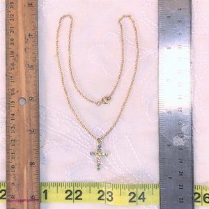 1) w/petite cross pendant with blue, green and yellow crystal rhinestone accents. Goldtone. Spring ring clasp. Pendant: 1"H including jumpring. 15 3/4"L.
