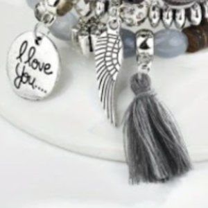 4 Pc Set Bohemian Style Creative Crystal Multilayer Stretchable Bracelet Silver Grey Tassel, I love you Charm, Wing Charm Stretches to fit most sizes 6.6" -8.2" Includes 4 separate bracelets that can be worn separately or stacked together