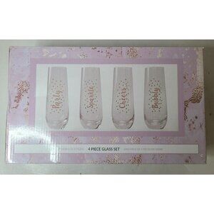 4 Piece Glass Set Party Sparkle Cheers Bubbly Rose Gold Letters Confetti 8oz NEW