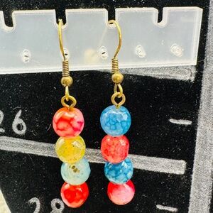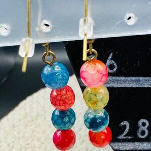 You will receive all 4 items listed pictured above. The necklace is gold tone with big faux pink beads and red beads. The bracelets is a 2 piece set. It has silver tone findings with red and white beads. Some of the beads have an iridescent to them. The earrings are on a bronze tone fish hook. The beads are meant to be in different order of color. They look like dyed gemstones unsure if they are real gemstones.