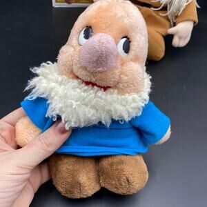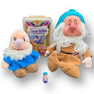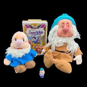 This 4 piece Disney Collection includes the following items -one vintage VHS tape. (Working) One 1993 Disney Store Sleeping (Sleepy) Doll. Excellent condion, eyes open and close. One mini plastic figurine, Bashful. (I think.) And one VERY old plush, missing hat. (Doc I think?) In good vintage condition. Smoke Free Home. Thank You For Checking Out This Listing, Please Check Our Profile To Bundle Or Make Offers.