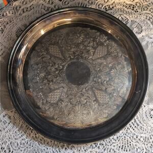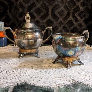 Full 4 piece silver plate coffee/tea serving set. This gorgeous vintage Mid-century set has been very well kept! It includes a round tray with pretty ornate etching, a generous sized coffee/tea pot, and a matching creamer and lidded sugar bowl. Each piece has such lovely details! The creamer, sugar bowl, and carafe all feature a pedestal base with four ornate feet and intricately curved handles. Treat yourself, or impress your guests, with this elegant set of serving ware!