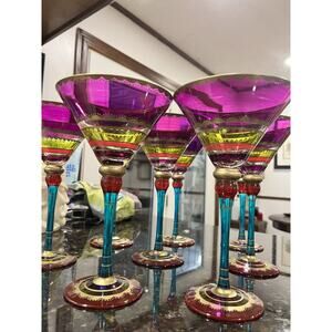 4 Pier 1 Festive Martini Glasses Blown Colorful Purple Stripe Gold Accent 8" Set
