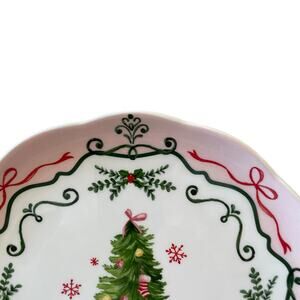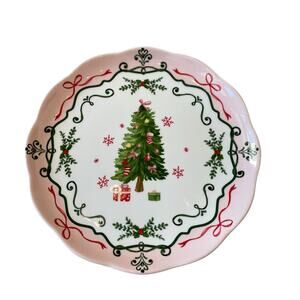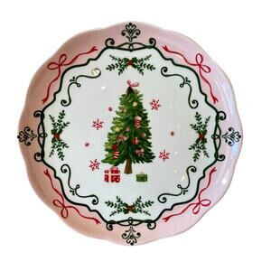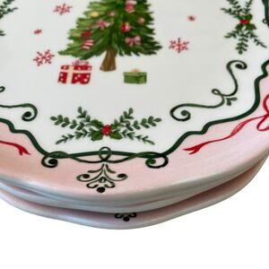 4 Potter's Studio CHRISTMAS TREE PINK Salad Plates 9in Ceramic Bows Brand NEW and BEAUTIFUL!