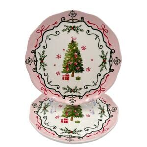 4 Potter's Studio CHRISTMAS TREE PINK Salad Plates 9in Ceramic Bows Holiday New