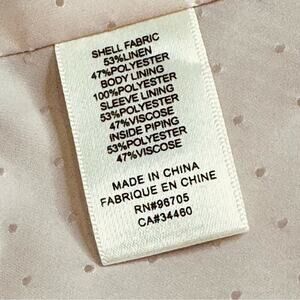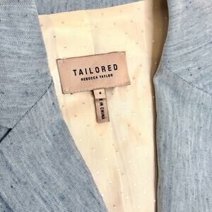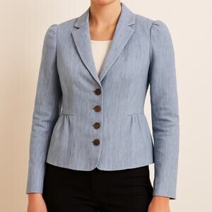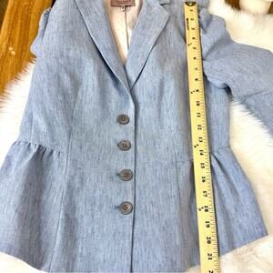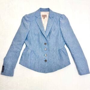 TAILORED by Rebecca Taylor Peplum Linen Blend Blazer. Button front, notched lapels, slightly puffed sleeve, lined. Light blue. 53% linen, 47% polyester.