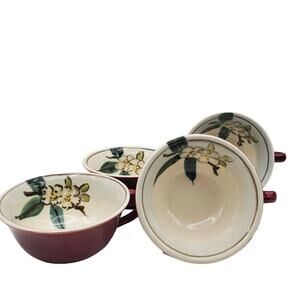 Red Wing Pottery Normandy Apple cup & saucer set of 4. The cups have a maroon exterior with the apple blossom on the interior. All are hand painted.