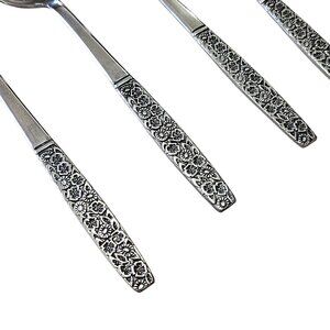 4 Rogers Fragrant Rose Spoon 6" stainless MCM Mod daisy floral Japan 70s vtg