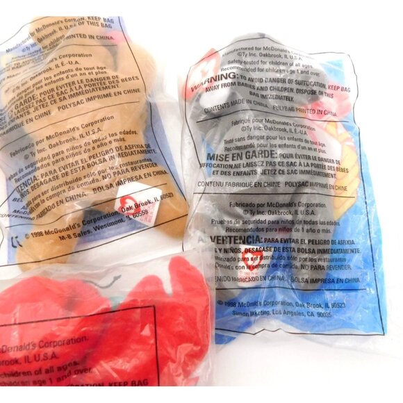 MCDONALDS / TY- Lot of four sealed Happy Meal Plush Beanie Baby Toys. Includes Pinchers, Bones, Mel and Zip. From 1998