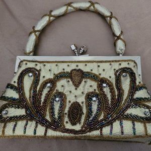 2. This is a gold and beaded purse with rhinestone clasp It has a detachable handle so it can be used as a small clutch. Has one small pocket inside and measures 8" x 4 1/2" x 2"
