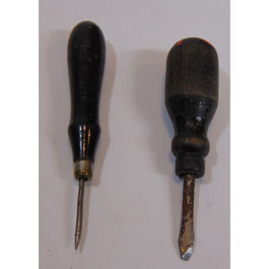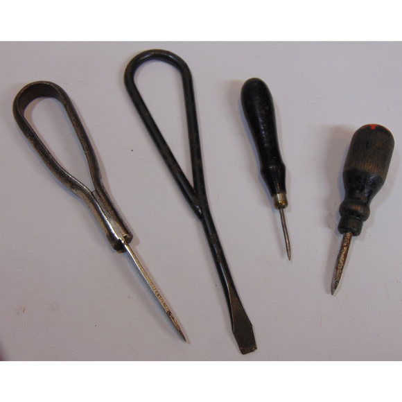 4 Sewing Machine Tools Stiletto Needle Screwdriver Early Pieces Antique Metal Wood Handles Collectible Museum Pieces Rare Finds