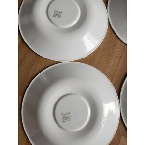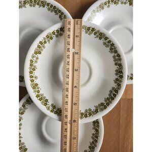 Set of 4 vintage Corelle teacup saucers in Spring Blossom green aka Crazy Daisy print. Pyrex compatibles design. Very good condition with minimal signs of use. No major utensil marks, print is shiny and intact. No chips, cracks or rough edges.