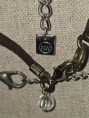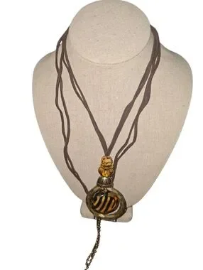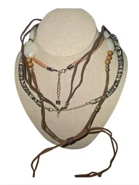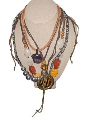Layered boho statement necklace featuring brown leather cords, orange and amber resin beads, and metallic accents. The brown and orange tones create a warm, versatile look. Lightweight layers designed for easy everyday styling.