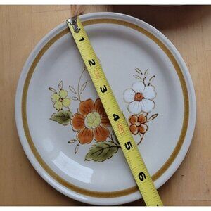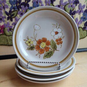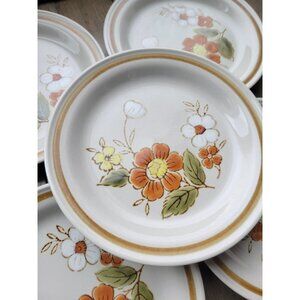 Set of 4 vintage stoneware ceramic plates in a retro neutral 1970s color palette. Mountain Wood Collection Trellis Blossom design 6" cake / dessert / bread plates. Yellow, white, and orange flowers on a neutral background, with a light brown circle on the rim.