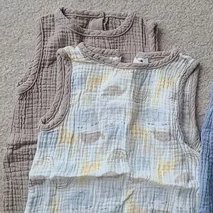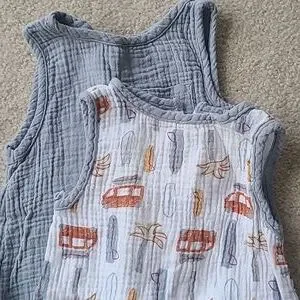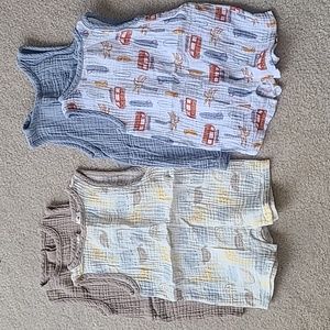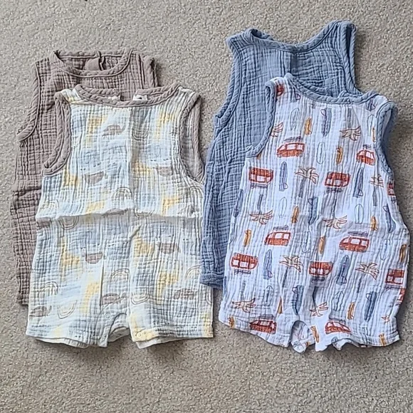 These light weight rompers were perfect for us during summertime in the south. Two with print, Two solid colors. All Gently used and in excellent condition