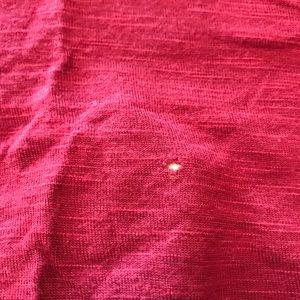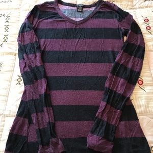 4 tops. All size medium. Black/gray one short sleeved. Maroon one is short sleeved with fringe bottom. Has small hole in front as shown in picture. Pale blue one is open shoulder with cute lace detail on bottom. Purple/black striped one is long sleeve. All are wrinkled from storage.