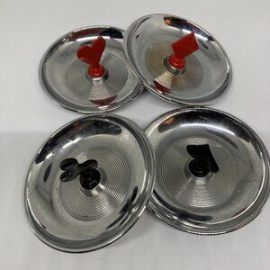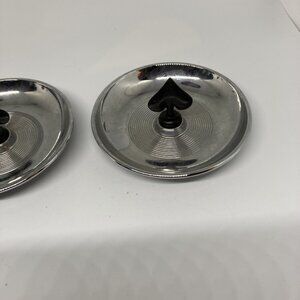 SET OF 4 IRWINWARE METAL ASH TRAYS IN BRIGHT SILVER WITH HANDLE IN CENTER OF EACH - 1 SPADE & 1 CLUB IN BLACK & 1 HEART & 1 DIAMOND IN RED - MADE IN USA. Very good vintage condition. So cute for card games or office deco.