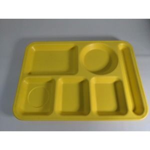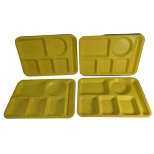 Introducing a set of 4 vintage Arrowhead stack lunch cafeteria trays made in the USA (Cleveland, OH) that comes in a lovely yellow color. The medium-sized rectangular trays feature a solid pattern with 6 compartments for all occasions. Each tray has a size of 14 inches in length and 10 inches in width, making it perfect for serving food and drinks.