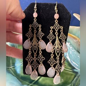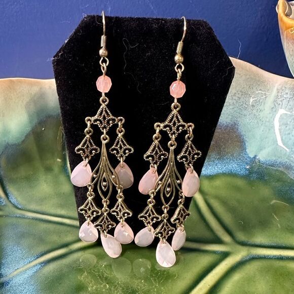 4” Vintage Chandelier Earrings Pink & Gold Tone