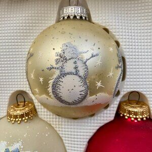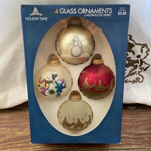 4 Vintage HOLIDAY TIME Christmas Glass Ball Ornaments Boxed Snowman Glitter USA