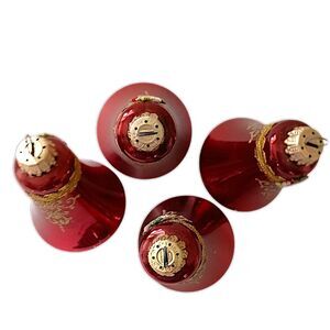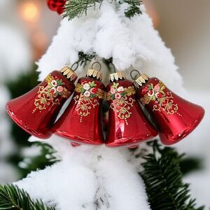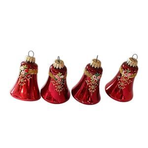 4 Vintage Christmas Bell Glass Ornaments Red Floral Gold Glitter West Germany