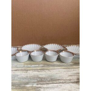 Each dish features a scallop shell design with gold trim and a built-in round sauce cup measuring approx. 2 5/8" in diameter—perfect for cocktail sauce, melted butter, or condiments. The shell portion is ideal for shrimp, oysters, or hors d’oeuvres.