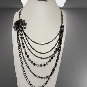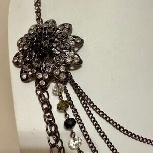 This is a unique 1920's flapper styel statement necklace featuring layers of gunmetal chains with beads and a striking floral pendant with rhinestones (2.25"). The chains are of varying lengths giving it a cascading effect. I don't know the brand but it's in excellent preloved condition.
