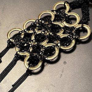 This is a cool, different piece! It features multi-layered black metal chains as a cord which are also intricately wrapped around a 12-ring silver tone hoop block with three dangly metal chains hanging like tassels from the bottom row. The metal hoop piece measures 2" x 3" and the layered chains hang down at 10". It's in strong condition overall but there is a bit of wear on the hoops (some of the silver is a bit worn on the outside edges).