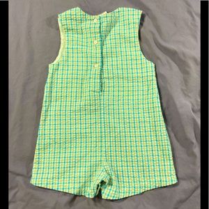 Boys romper has been worn but is still in good shape for the next little boy. Turquoise and tan plaid seersucker on white background 4 grippers at crotch. 3 buttons on the back and buttons on shoulder to help with getting it on.