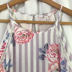 Candies Floral High Neck Handkerchief Hem Dress. Purple and white stripes with pink, peach,navy and soft blue florals. Has zipper and button closure. Darts. Lace on arms and hem is see through. White lining. From center back shortest length is 41” and longest is 55”. Chest is 21.5”. Size XL