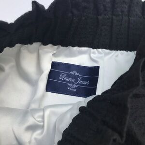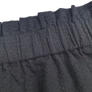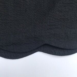 Lauren James Seersucker Paper Bag Waist Scalloped Hem Skirt. Black with white lining. Scalloped Hem goes all the way around the entire bottom of skirt. Elastic Waist will max to 16.5 inches. Size XS. Length is 18.5 inches. 2 functioning side pockets.