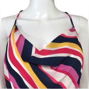 Summery Diagonal Stripe Halter Cowl Neck Dress. Adjustable spaghetti straps. MIDI length. Lined with cream slip. Pretty summer colors of sunflower yellow, cream, navy, pinkish red and lighter pink. Elastic waist also has tie detail. Waist is Layflat 14 minimum, 18 max. Length from pit seam is 33”. Layflat Chest is 18 to 20 approximate inches. Size small