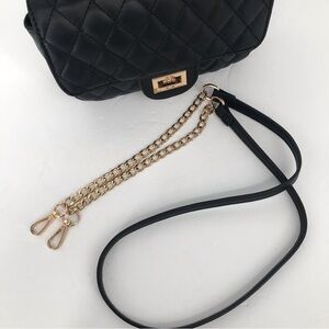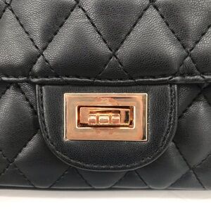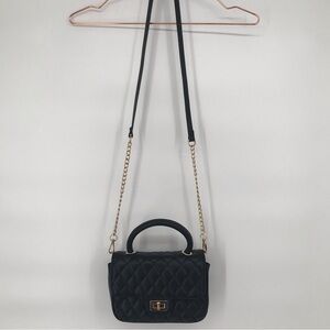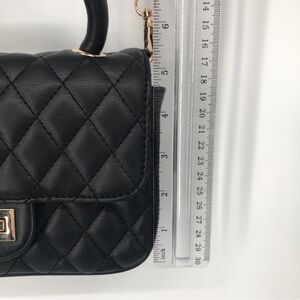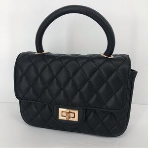 Soft Vegan Faux Leather Quilted Convertible Handbag. Crossbody strap or remove it and use the top handle. Twist lock is the only spot that shows wear. Black with gold hardware. Great size for daily use! Approximately 5.5” by 8”. Strap drop on crossbody strap 24”