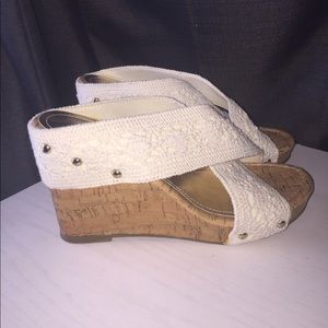 These four inch wedges are comfortable. There's no strap on the back of your heal and the white material makes these shoes easy to walk in.