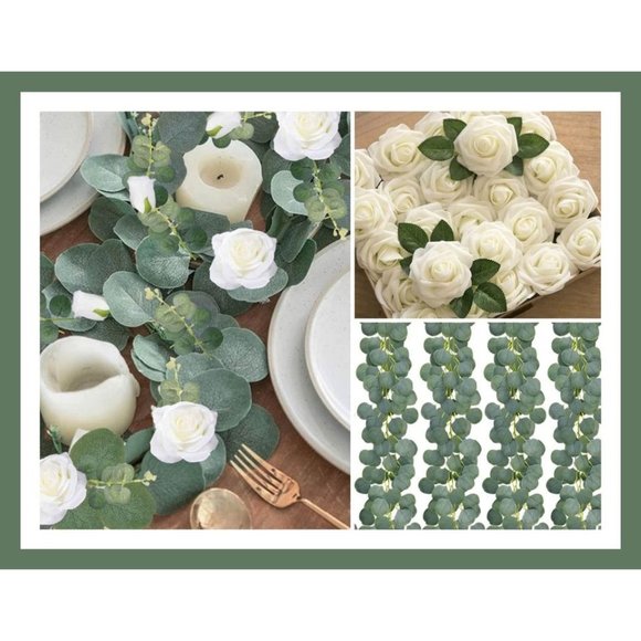 4 pack Eucalyptus Garland & 25 count Ivory Roses Set Wedding Decor