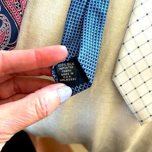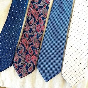 A set of 4 neckties, all in excellent condition. 2 are 100% silk, 2 are 100% polyester. In a beautiful array of blues, whites, and 1 with red paisley.