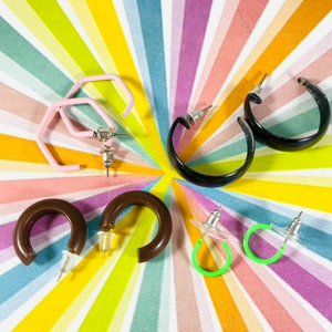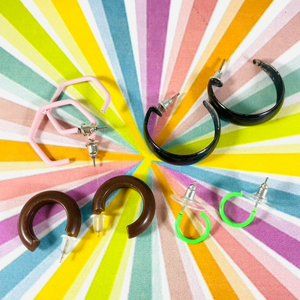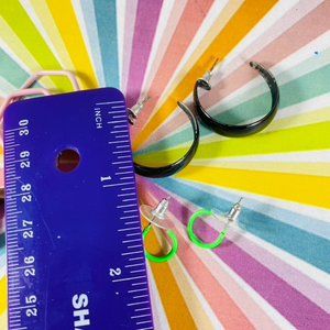4 pairs of vintage hoop pierced earrings Neon Green, Brown, Pastel Pink, Black