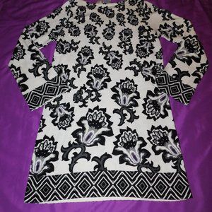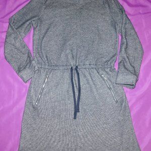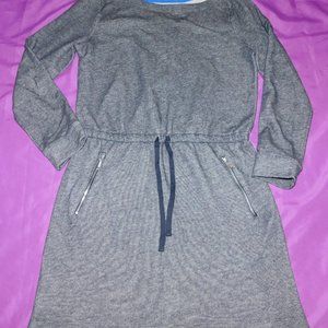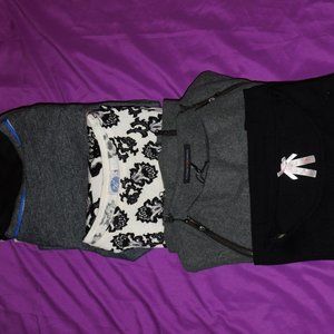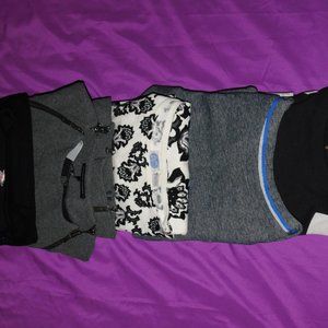 Selling a 4 pc set of comfortable, stylish winter dresses. 1 black, white and purple baroque style dress with bell sleeves, 1 black & gold baroque style dress, 1 black & tan color-blocked dress, 1 grey long dress with zipper pockets, does NOT include 4th grey dress in group photo.