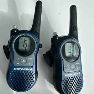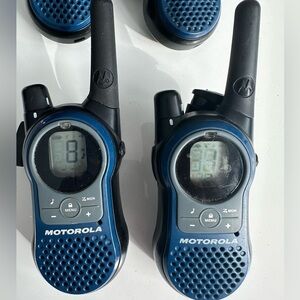 4 Motoral walkie talkies, two have the rubber cover on the dial missing but works. Comes with 2 in ear piece head phones as shown. They are pre owned from my restaurant business, takes 3 AAA batteries to operate.