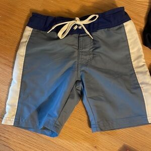3 swim trunks - assorted brands, and 1 long sleeve navy blue rashguard.