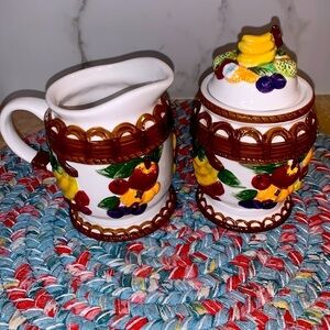4 pc Set Ceramic Fruit Basket Motif 2 Mugs-Creamer/Pitcher & Covered Sugar Dish