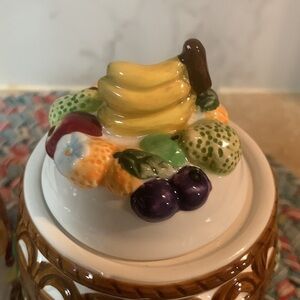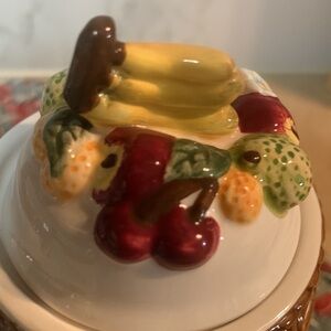Textured, embossed 3D colorful fruit bowl pattern on all 4 ceramic pieces - watermelon, cherry, blueberry, strawberries, oranges, apples, pears, pineapple, banana, grapes etc with brown basket weave throughout, super cute!