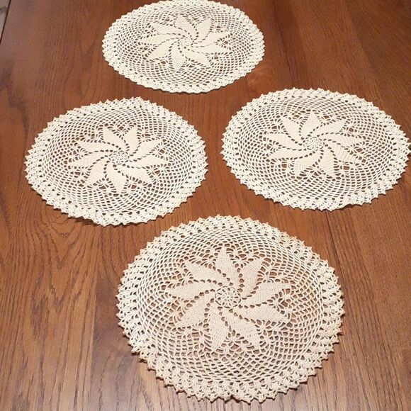 4 pc bundle vtg. Ecru Crocheted pinwheel design 9-10" doilies.