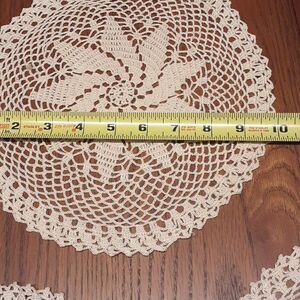 4 pc bundle vtg. ecru color Crocheted pinwheel design 9-10" doilies. Beautiful designs and hand crocheted. Preowned. Non smoking home. In excellent condition. As with any vintage item, there may be slight color differences with tea staining etc. but that is how they aquired a beautiful unique color, so these are not blemishes.)