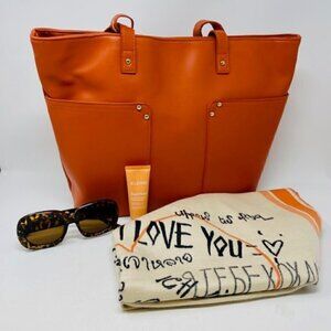 Roomy, orange vegan leather tote with gold accents, tortoise framed sunglasses, soft, luxurious scarf and 20 mL Elemis Superfood Glow Priming Moisturizer to keep your skin hydrated and glowing.
