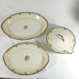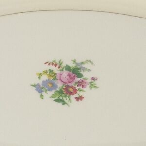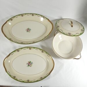 Similarly, the Warwick B9289 Oval Serving Platter measuring 14 inches in length showcases the same exceptional qualities. It also features the Warwick Green Scale Band Floral Bouquet and Swag pattern, contributing to its sophisticated appeal. This platter is suitable for serving a range of dishes, from appetizers to main courses, and will complement any table arrangement with its timeless design. Like its larger counterpart, this serving platter is in excellent used condition, exhibiting minimal signs of wear while retaining its beauty.