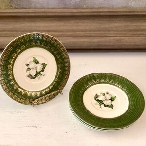 Set of 4 saucer plates by American Limoges L'Triomphe Trillium Forest Green Dinnerware 22K Gold