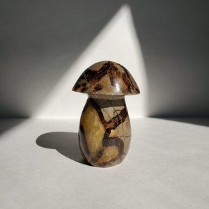 This is a gorgeous, handcarved, chunky Septarian crystal mushroom. This substantial mushie has very pretty coloring of gray yellow & brown, stands approximately 4" tall and is approximately 2.5" wide.